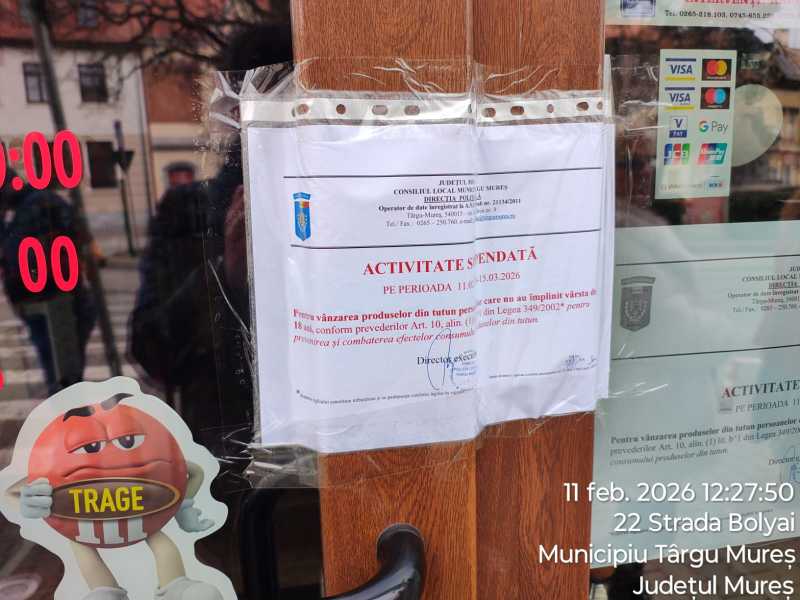 ‘Polițiști locali din cadrul Compartimentului Control Comercial, al Direcției Poliția Locală Târgu Mureș, a efectuat, în data de 11.02.2026, o acțiune specifică pe linia respectării legislației privind comercializarea produselor din tutun, în urma căreia o societate comercială a fost amendată cu 10.000 lei și i s-a suspendat activitatea pentru o perioadă de 30 de zile. Reprezentantul societății comerciale a fost surprins, de echipajul de Poliție Locală, în momentul în care comercializa pliculețe cu nicotină pentru uz oral (pouch-uri) unor elevi aparținând unităților de învățământ din proximitatea magazinului’, a anunțat Direcția Poliția Locală Târgu Mureș pe Facebook.